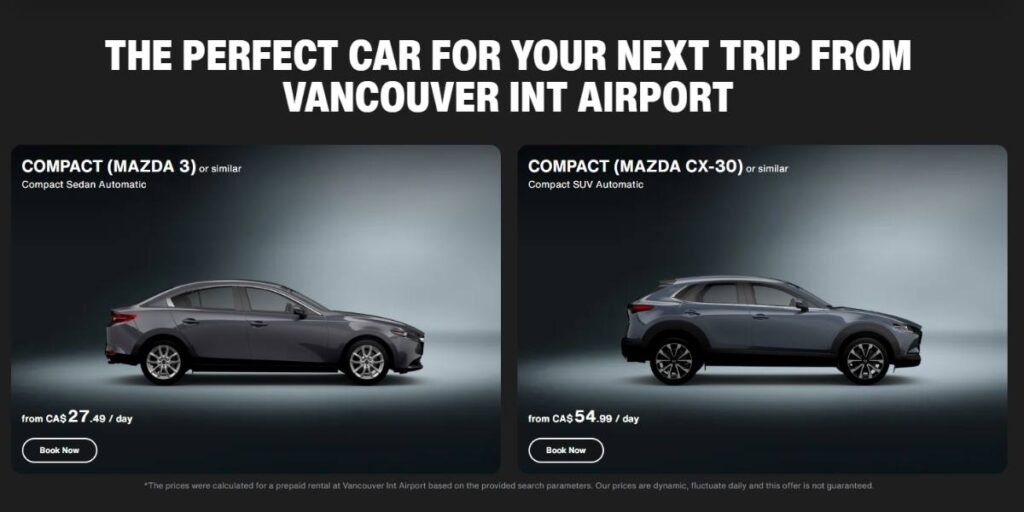 They stand out with a premium fleet. From compact sedans like the Mazda 3 to SUVs such as the Mazda CX-30 or Toyota Camry, often at competitive dynamic rates (starting around CA$27–55/day for prepaid bookings). Add extras like GPS, child seats, or additional drivers effortlessly. Customers rave about the service, earning them 4.7 stars from thousands of reviews